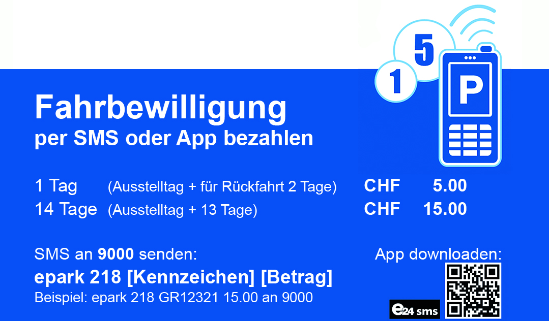 Die Fahrverbotstafeln wurden aufgestellt, womit das revidierte Strassengesetz der Gemeinde Obersaxen Mundaun in Kraft ist. Die Fahrbewilligungen für das Befahren von Wald- und Güterstrassen auf dem Gebiet der Gemeinde Obersaxen Mundaun können am Schalter der Gemeindeverwaltung während den Öffnungszeiten bezogen werden. Tagesbewilligungen (CHF 5.00) und 14-tägige-Bewilligungen (CHF 15.00) können zusätzlich per SMS oder bei den weiteren Ausgabestellen gelöst werden. Alle Informationen finden Sie auf unserer Webseite www.obersaxenmundaun.swiss unter Online Schalter.